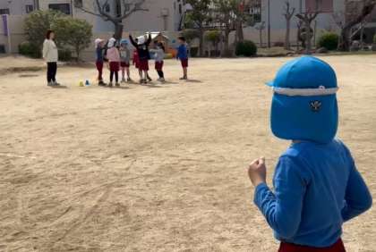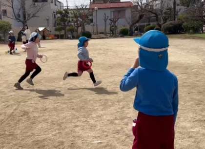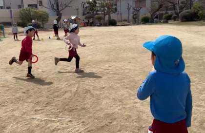 あお組で遊ぶのも最後の日なので、園庭で遊んだ後、最後のリレーをしました。友達の走っているいる様子を一生懸命に実況中継している子もいました。
