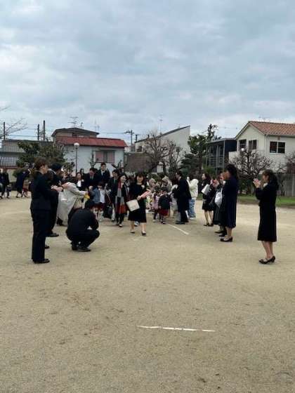 園庭ではあか組、もも組が花道を作ってくれて、小学校に巣立って行きました。