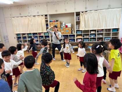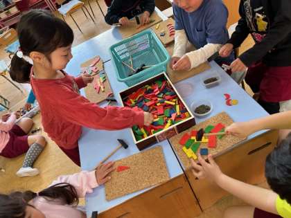 入園式が終わり、登園してきた子どもたちは朝から遊び始めました。お部屋では、くぎ打ち遊びをしたり、みんなで仲良し遊びをしたり、うんていに挑戦したりして、楽しんでいました。