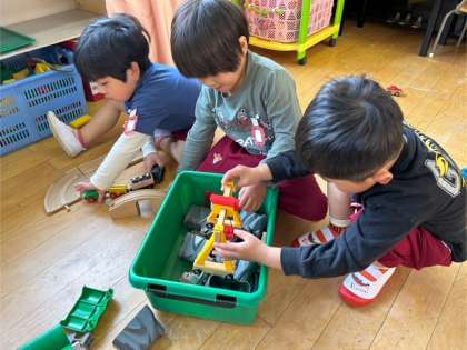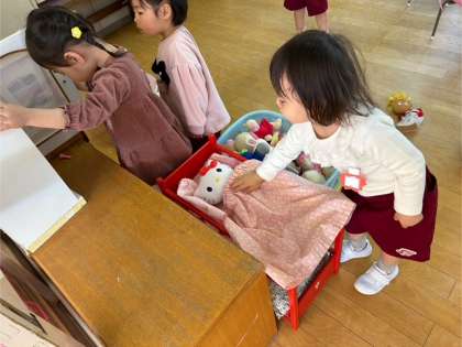 入園式後の初めての登園でしたが、ほとんど泣かずに遊び始めました。大好きな車で遊んだり、ぬいぐるみでごっこ遊びをしたりして近くにいる友達と少し関わりながら遊んでいました。