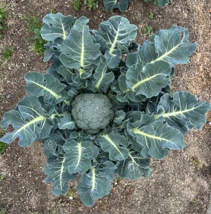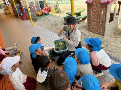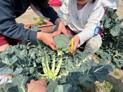 あか組の時に植えたブロッコリーが大きくなり、みんなで収穫することにしました。「ブロッコリー大好き!」「どうやって食べようかな」と楽しみにしながら収穫しました。大きなものと小さなものがあるのを見て「これがいい」と大きいものを持って帰りたいと言っていました。すると「半分しよう」という子どもがいて、「そうやな、小さいのもあるしな」と分け合って持ち帰ることにしました。