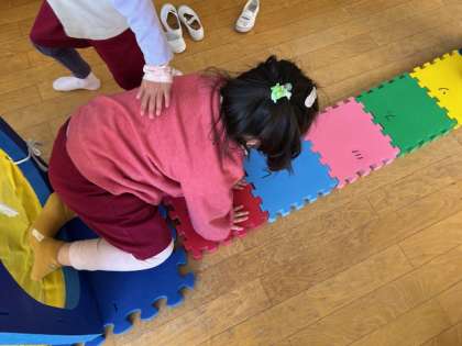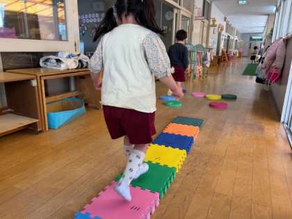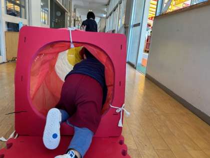 鯉のぼりをくぐって遊んでいたので、トンネルを探しに行きました。子どもと一緒に運んできて、遊び始めると、他の子どもたちも集まってきて、みんなで遊びました。「よーいどん!」とスタート地点でいう子どもやトンネルを何度もくぐる子ども、音の鳴るマットをゆっくり鳴らして歩く子どもなどいろいろな部分で、それぞれが楽しんでいました。