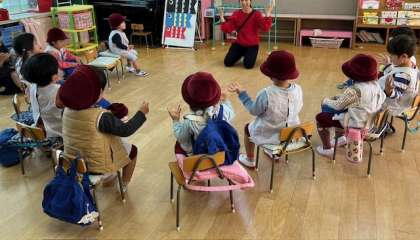 今日から11時30分帰りになったもも組。おかえりの用意をして、みんなで「とんとんとんとん、アンパンマン、とんとんとんとん…」と先生と一緒に手遊びを楽しみました。