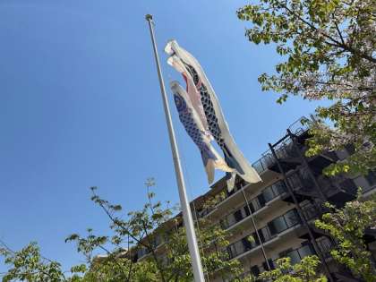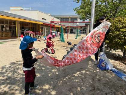 今日も鯉のぼりをあげました。先生と一緒に向きを考えて、風が吹いても飛んで行かないようにしっかりと結んで、あげると風を受けて泳ぎ始めました。