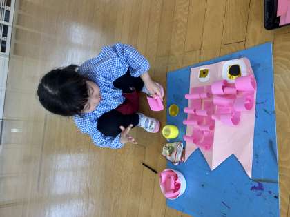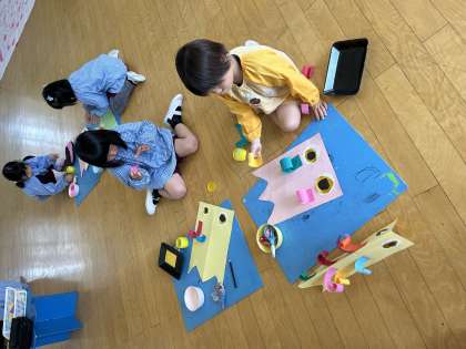 鯉のぼりと遊んだり、揚げたりして鯉のぼりに親しんでいたあお組の子どもたち。今度は、自分たちの鯉のぼりをつくることにしました。目をつけると泳がせている子どももいました。