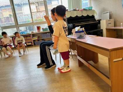 あか組では、「青虫、見つけた」と知らせました。「ちょうちょになるんやで」「葉っぱ食べる」「ここにもおるで」と知っていることを言い合い、知らなかった子どもたちも興味をもって見ていました。