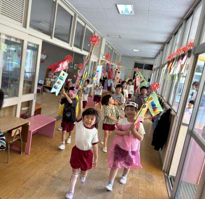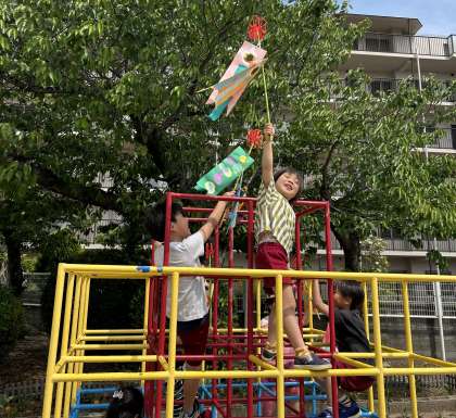 あか組や預かり保育に参加しているもも組に見せたり、リズム室や園庭に行ったりしながら、「屋根より高いこいのぼり♪」と友達と嬉しそうに歌っていました。