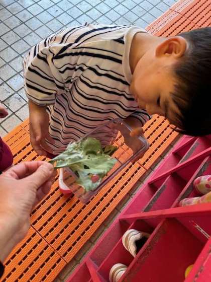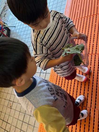 昨日見つけた青虫はどうなっているのかを確かめました。葉っぱに穴が空いて、黒いうんちをたくさんしていました。「なんか大きくなってるな」「ちっちゃいのもここにおるで」と近くで見ていました。