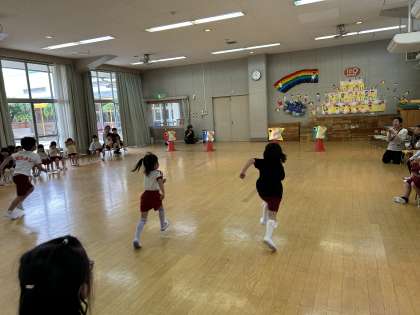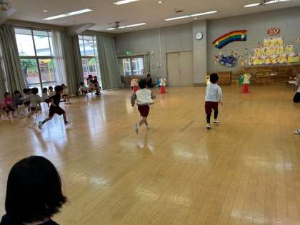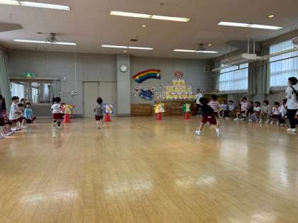 雨で室内になってしまいましたが、みんな元気いっぱい、好きな色のこいのぼりに向かって走りました。
