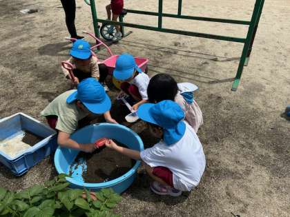 ダンゴムシをたくさん見つけて、「土を入れてあげないと」と一生懸命にタライに土を入れてお家を作ってあげていました。