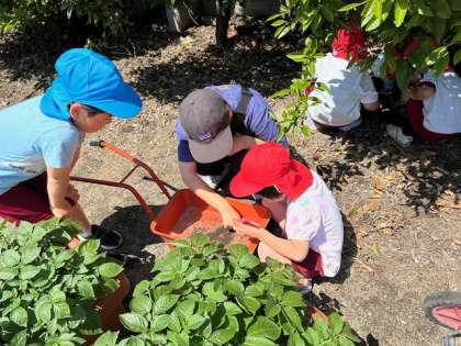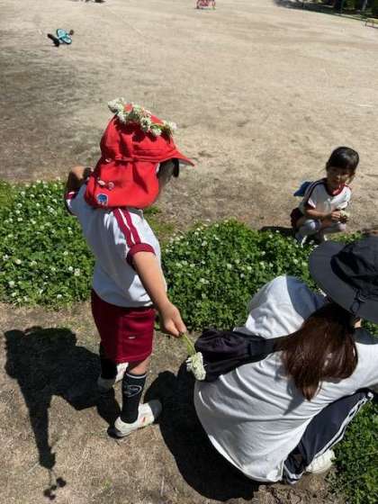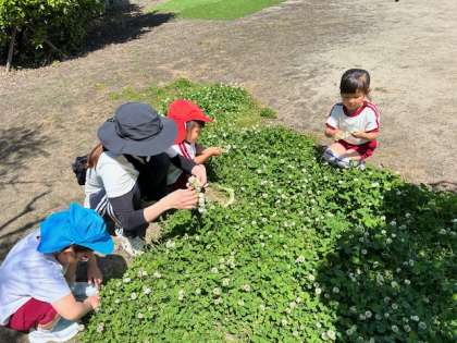 園庭で、ダンゴムシを探したり、シロツメクサを摘んでお花の冠を作ったりして楽しんでいます。