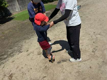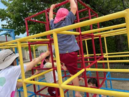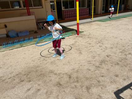 おっとっとに乗ったり、フープを腰で回したり、ジャングルジムに登ったりしながら、自分で挑戦して「見て」「できるようになってきたよ」と知らせてくれます。少し難しいことにも挑戦して、日々できることが増えてきています。