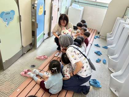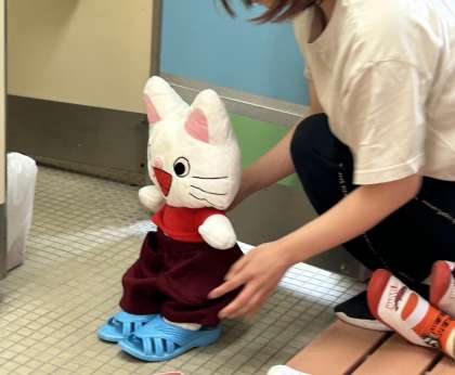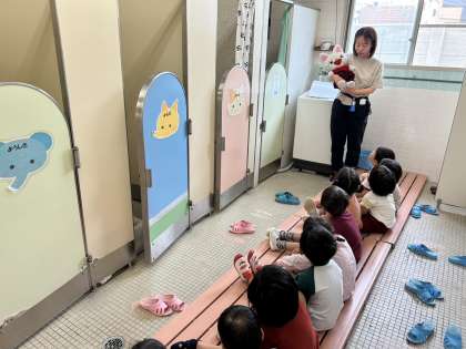 もも組にトイレの手順についての保健指導をしました。子どもたちに人気のぬいぐるみを用いて、上靴とスリッパを履き替える場所や、扉の中の見えないところで脱ぎ着をすることを知らせました。指導後は、ぬいぐるみの真似をして、正しい手順でトイレができるようになっていました。