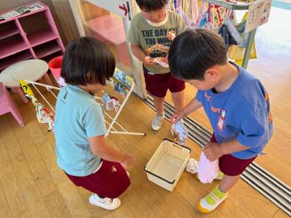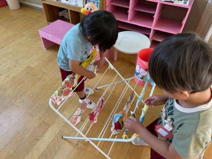もも組は、入園して1ヶ月が経ちました。幼稚園生活を楽しめるようになってきています。製作するときに使った雑巾が洗濯して置いてあるのを見つけて、自分たちで干していました。