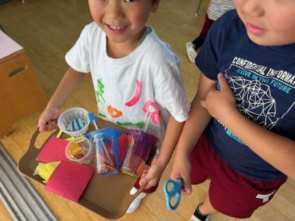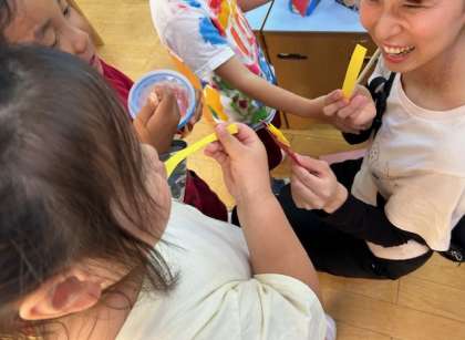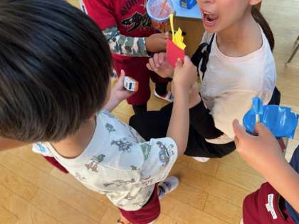 「今日はジュースです」「飲んでください」「これはイチゴジュースです」「先生、どうぞ」「ポテトもありますよ」とごっこ遊びを楽しんでいました。自分たちが遊びたい、必要なものを自分たちで作って、楽しんでいます。