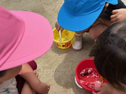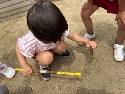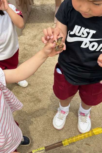 時間をかけて待っていると、「やった、釣れた」と喜んで見せにきました。「背中を持ったら自分で持てるよ」と知らせると挑戦し、「持てた」とまたひとつできることが増えました。