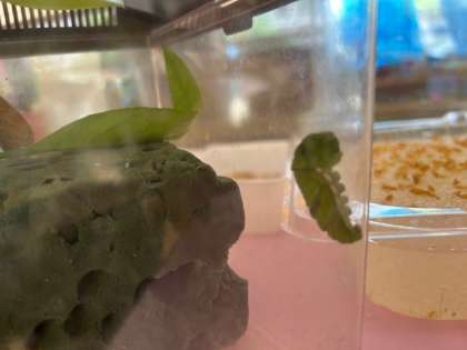 あお組の青虫がさなぎになりかけていました。もも組が不思議そうに眺めたり、ケースを揺らしたりしていました。あお組が飛んできて、「あかんで」「揺らして落ちたら、ちょうちょになられへん」と言い、あわてて手を離していました。