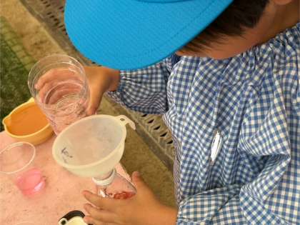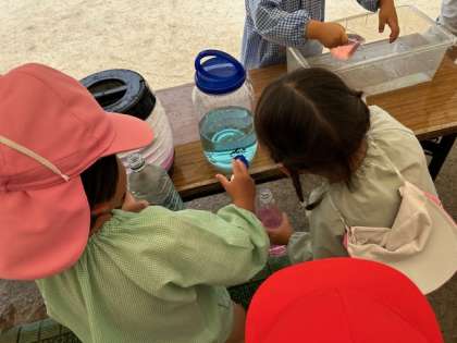 スーパーボールをすくったり、色のついた水をペットボトルにうつし換えたり、こぼれる水を「あー」と言いながら、どうすればたくさん入るか試したり、友達の様子を見て気付いたり教えてもらったりしながら、挑戦していました。