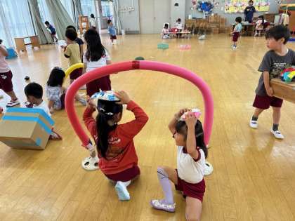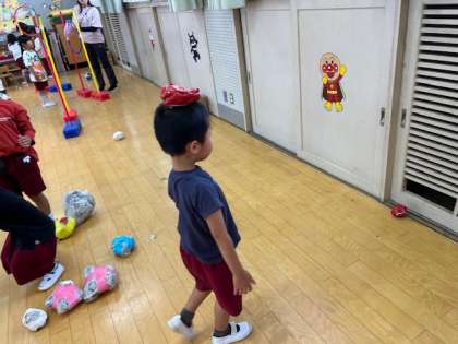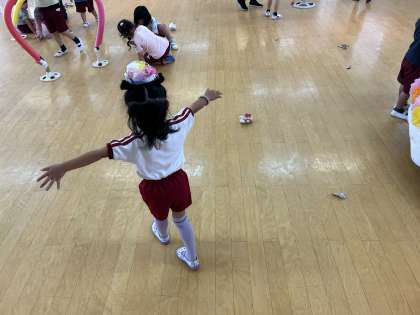 新聞ボールを頭に乗せて、落ちないように歩いて、楽しんでいました。バランスよく歩くことは難しいですね。低いアーチもくぐろうと挑戦していました。あお組がしている様子を見て、あか組も「僕もできるで」といって、真似をして楽しんでいました。