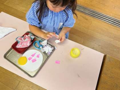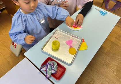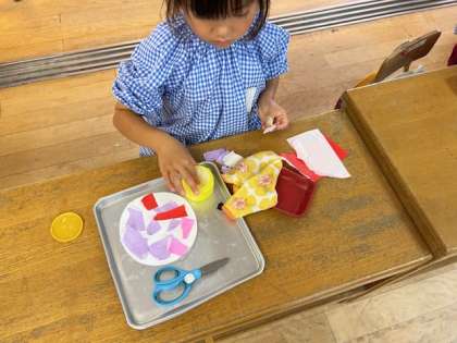 からに模様をつけて、おしゃれなかわいいカタツムリを作ることにしました。きれいな色の折り紙を小さくちぎって模様をつけていきました。「私はピンク」「水色ばっかりにしよう」とたくさんちぎって貼っていきました。「目はどこにあったかな?」と考えて、つけていました。
