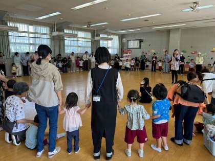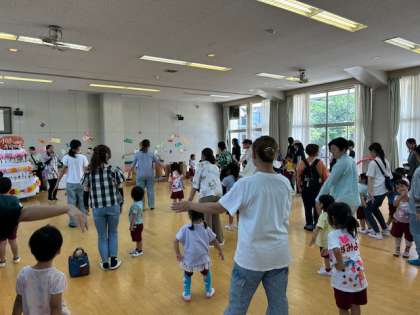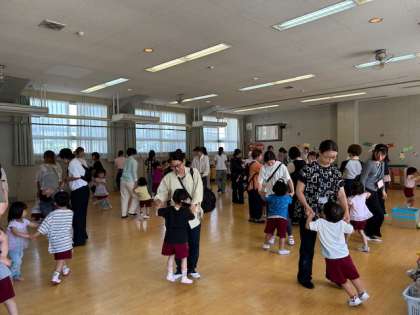 こいぽぽり体操をみんなでしました。繰り返しの動きなので、おうちの人もすぐに体操することができました。その後、「よろしくね」のなかよし遊びをお家の人としたり、幼稚園のみんなでしたりして遊びました。
