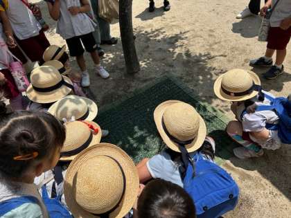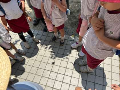 またあお組のあおむしがチョウチョウになりました。ちょうど、おうちの人も来られていたので、一緒に飛ばしてあげました。でも、なかなか飛び立たなくて、子どもたちが飛び方を教えてあげたり、3、2、1、0と数えてあげたりしましたが、少しずつ進むだけで飛び立たず、羽根を乾かしているようでした。木に止まっていたので、また飛び立っていくでしょう!