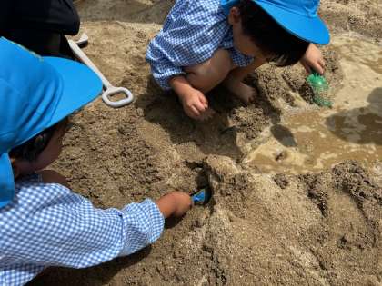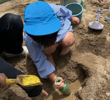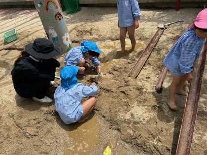 砂場に水が流れる道を作り、途中をせき止めて、砂を盛り上げ、トンネルを掘っていました。「モグリン出動」「水玉くんくんが流れるよ」と言いながら、何度も崩れては「もう一回!」と砂を盛り上げ、挑戦していました。つながりそうになると崩れて…を繰り返して、先生が「おしい」「もうちょっと」とそばで寄り添い、「スーパーモグリン出動」と何度も挑戦した結果「やったー」「水玉くんくん、きたー」と大喜びでした。「モグリン?」と見に来た友達も一緒に喜んでいました。