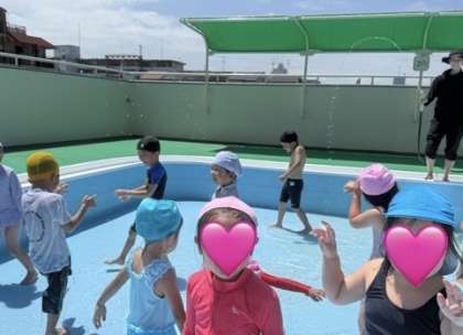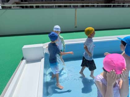 プール掃除を頑張ってくれたあお組さん。きれいになったプールで水遊びをしました。「気持ちいいー!」「わたしもお水かけてー!」と水の心地よさを全身で感じていました。