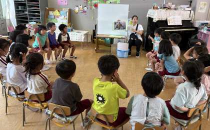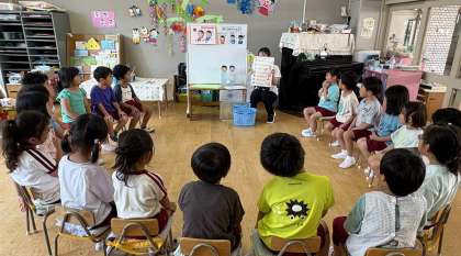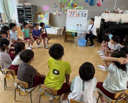 あお組に熱中症予防の保健指導をしました。汗をかいて体の中の水がなくなってしまうと、頭が痛くなったり、気持ち悪くなってしまう「熱中症」になってしまうことと、熱中症にならないための合言葉「すみよしあそぼ」を知らせました。「すみよしあそぼ」は、「すずしいところでやすむ」「みずやおちゃをたくさんのむ」「よくねる」「しんどいときはおとなにいう」「あさごはんをたべる」「そとにでるときは ぼうしをかぶる」です。指導後、子どもたちは、養護教諭に覚えた合言葉を教えてくれたり、自分からお茶をしっかり飲んだりしていました。これからも合言葉を思い出して、夏を元気に過ごしてほしいです。