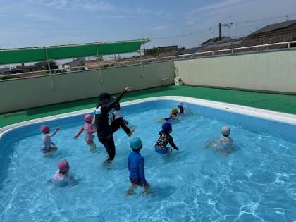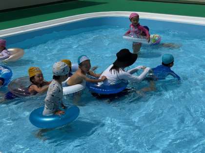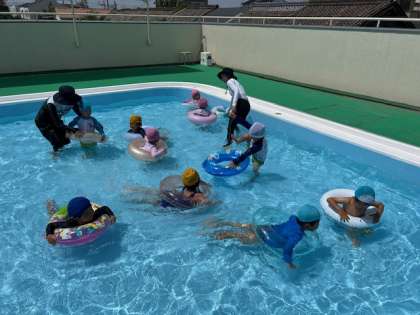 子どもたちと考えて、ウサギやゾウ、キリンになって水の中を歩きました。浮き輪を見つけていて、一人一つで、つながって遊んでいました。