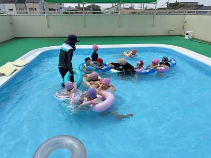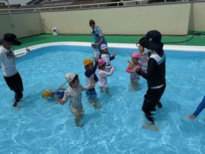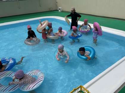 毎日プールに入れて、子どもたちは大喜びです。初めは怖がっていた子どもも毎日入って、水に慣れてきて、浮き輪で遊んだり、「エビカニクス」を踊ったりして楽しんでいます。浮き輪での遊びも友達とつながったり、気持ちよさそうに浮かんだりして遊んでいます。