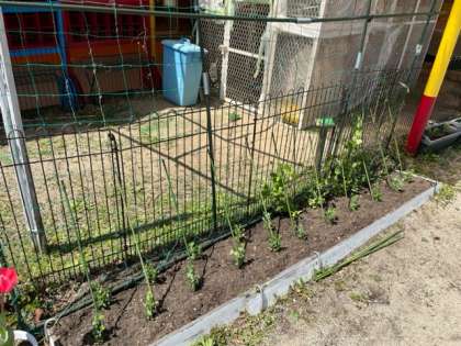 インゲンマメの芽が大きくなってきてたので、花壇に植え替えました。