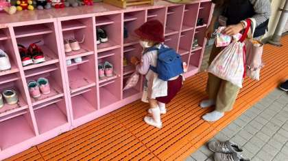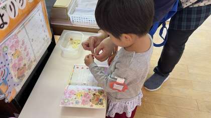 「一緒に貼ってみようね」と、先生と一緒にシールを貼ります。