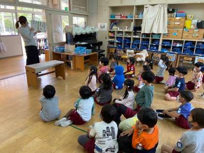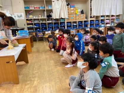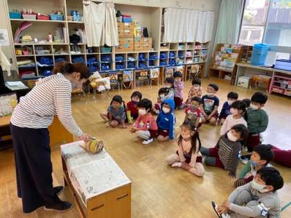 あお組はみんな、昨日触ってみた筍なので、実物とも比べながら、興味津々で見ていました。「筍は、竹やぶに土の中から生えてくるんや」「見たことないな」