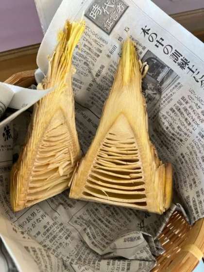 昨日皮をむいた筍を2つに切ってみました。すると、中は何段にもなっていました。下にいくにつれ、段が大きくなっていました。下の方は大きな隙間がありました。