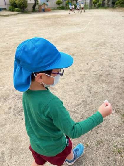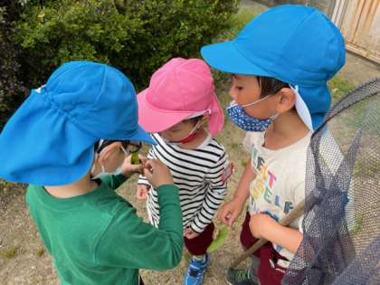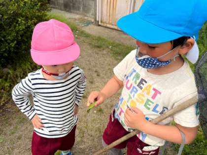 お天気もよく、虫探しをして、セミの抜けがらを3歳児に説明してあげたり、モンシロチョウをてでつかまえたりしていました。