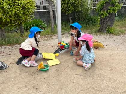 一緒に砂でままごとをしたり、「お部屋に帰る時間だよ」と優しく手をひいて、送り届ける年長児の姿がありました。