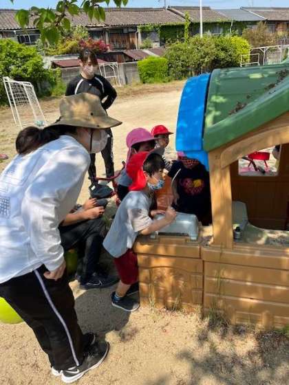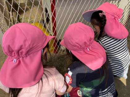 うさぎさんに草を摘んできて、「この草食べるかな?」「おいしいよ」と友達と一緒に小屋をのぞき込んでいました。