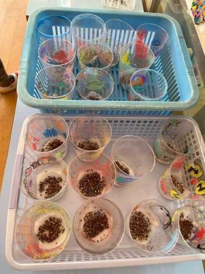 ブロッコリースプラウトの小さな種をコップで育ててみることにしました。種を撒いてみると、すぐに水を吸って、種の色が茶色から白に変わったものがありました。すぐに外側の皮が破れて、少し芽を出し、びっくり!透明のコップなので、よく見えて、毎日覗き込む姿があります。絵をかいた自分のコップを探して、「ちょっと出てきた」と楽しみにしています。