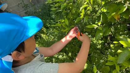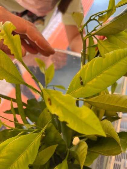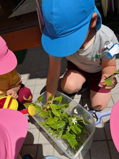 ミカンの木にアゲハ蝶の幼虫や卵を見つけました。「見せて」ともも組さんも興味津々で見ています。