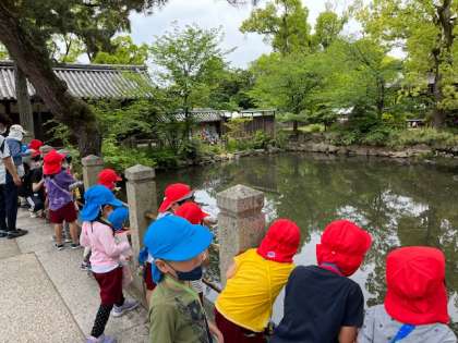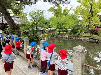 「あそこに亀がいるよ」「見える?」「今日はザリガニも見つけた」と知らせていました。「柵に乗ったらあかんで」「危ないからな」とあか組に言葉をかけていました。