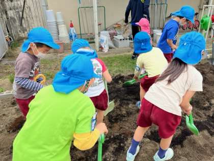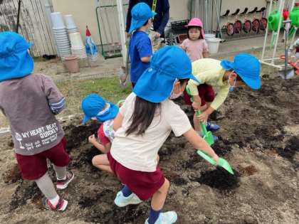 あお組は途中で、幼虫やみみずを見つけて遊んだり、土の感触を楽しんだりして、選んだ野菜の苗をお家の人と一緒に植えることを楽しみにしていました。