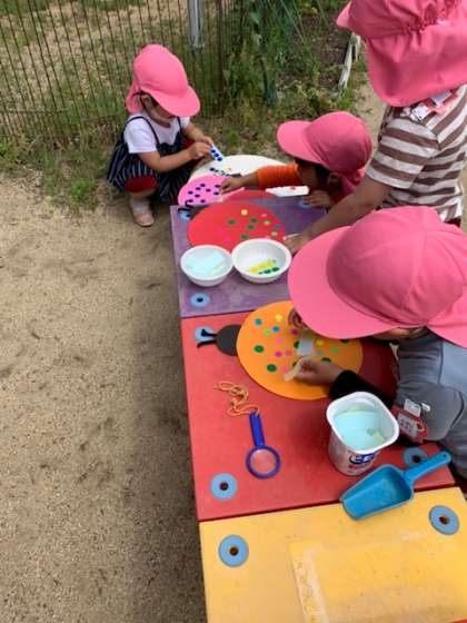 お庭でシールを貼って、てんとう虫を作りました。作ってからすぐに、てんとう虫と一緒に散歩にいく子どもたちもいました。お部屋にも飛ばしてあげよう!と壁面に飾りました。