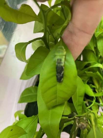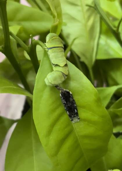 あお組の子どもたちが「見て!見て!」と、飼育ケースをのぞきこんでいました。黒かった幼虫が大きくなり、半分くらい緑になってきていました。「脱皮や」と言う子どもがいて、見ていると、モゾモゾと動き出して…脱皮が進みました。目の前で、最後の黒い皮を脱ぎました。「すごい」「今日は雨で嫌やったけど、いいことあったな」と大喜びでした。