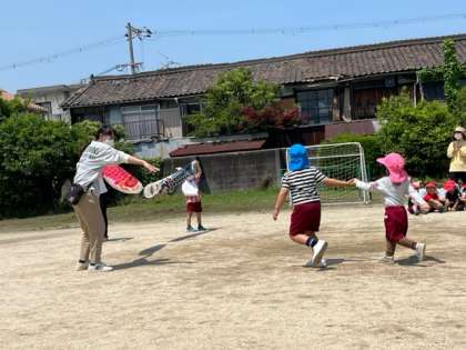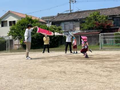園庭で、普段から異年齢での交流をしながら体を動かして遊んでいる様子を参観していただきました。1週間延期になりましたが、晴天のもと、笑顔の子どもたちの様子を見ていただくことができました。