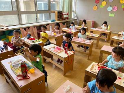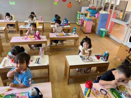 もも組はお弁当を食べる時間を楽しみにしています。お家の人が作ってくれたお弁当はとっても美味しいようですね。