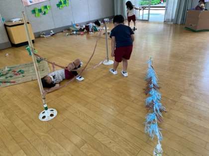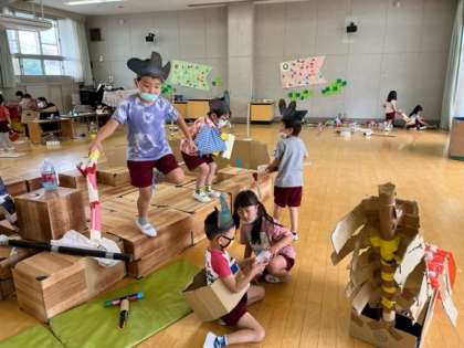 わんぱくだんシリーズの絵本から想像を膨らませて、素材でいろいろなものを作り、大型積み木を船に見立てて、遊んでいます。恐竜や海賊もいますよ。想像を膨らませて、それぞれの役になりきっています。