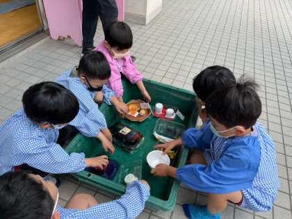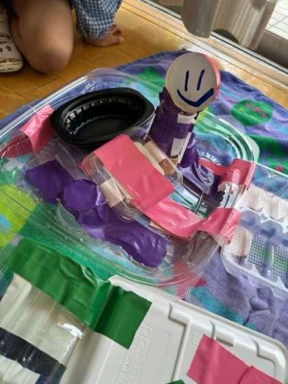 動かしながら作り、様々な仕掛けを考え、作った後は水に浮かべて確かめていました。一緒に浮かべている友達の作品を見て、「かっこいいな」「僕も乗ってるん?」と話していました。