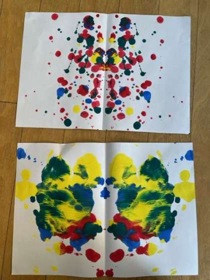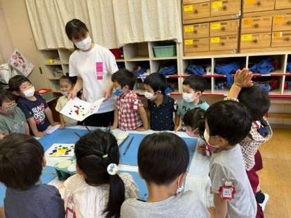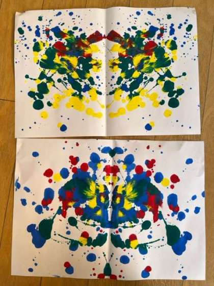 紙にいろいろな絵の具をのせて、紙を半分に折って、「魔法をかけてみよう!」と、上からこすると不思議!な模様ができました。「やってみたい」と興味津々のあか組。みんな違う、自分だけの模様が現れて、「わー、チョウチョみたい」「恐竜みたい」と模様から想像をふくらませていました。