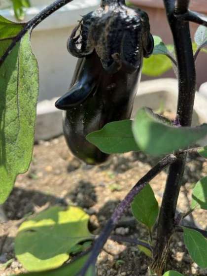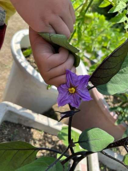 「お野菜もできてるね」と見ていたら、なすびに鼻のような突起が出ていました。「顔みたい」と言っていました。昨日見つけた子も、また見に来ていました。
